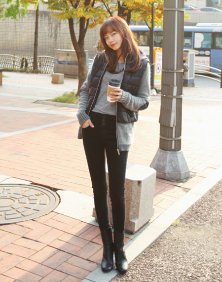 拼接大衣+修身牛仔裤+高跟短靴,羽绒背心拼接针织开衫,舒适保暖,下搭深色修身牛仔裤和黑色短靴,显得腿部修长。(合作媒体:)