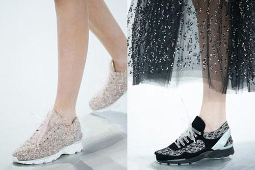 如果你觉得Dior的珠宝镶嵌运动鞋好像有点变异,那Chanel秀场上的各种运动鞋一定会让你大开眼界。这些粗花呢、蕾丝、蟒蛇纹、珍珠装饰的运动鞋,来自法国高级定制鞋履工坊玛萨罗 (Massaro),一双定价在3000欧元上下。模特是蹦跳着走过来的,如同冰雪世界里的小仙子,据说这是Chanel创意总监Karl Lagerfeld亲自指导的台步风格,用他的话说:“欢快地蹦跳着走高级定制的台步,难道不很Chic吗?”