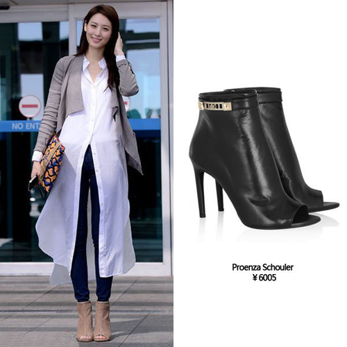 中国鞋网3月13日讯,韩国仁川,韩国女星金秀贤现身机场。她身穿灰色不规则短衫,内搭白色长款衬衫裙,下配铅笔裤,脚踩裸色高跟鱼嘴鞋,帅气潮范亮相。