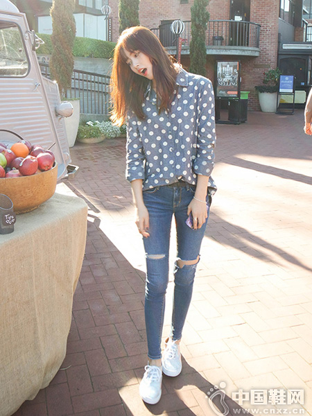 波点衬衫+牛仔小脚裤+运动鞋,蓝色衬衫上波点点缀,甜美俏丽,紧身牛仔裤修饰腿部线条,配运动鞋穿出韩范儿。