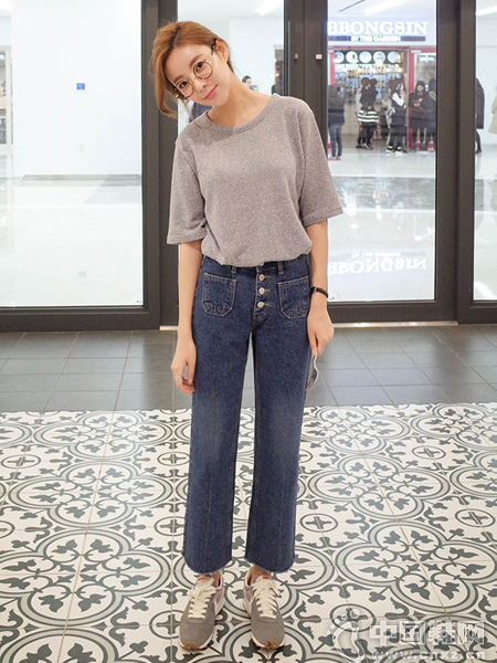灰色T恤+复古牛仔裤+运动鞋,简洁的灰色T恤搭上长度仅到脚踝上方的复古宽腿裤,极具休闲时尚感,载踩上运动鞋,更显自然。