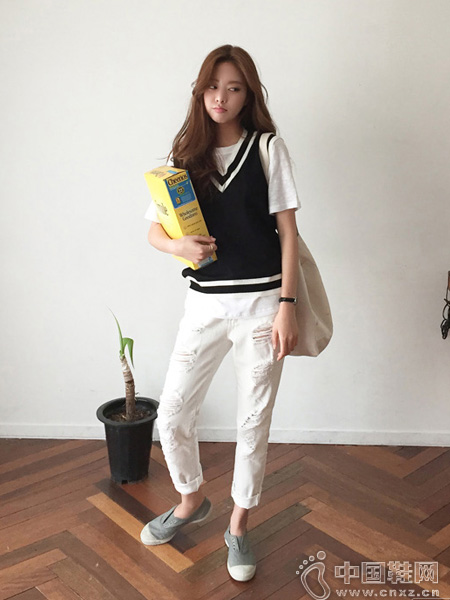 T恤+背心+白色牛仔裤+帆布鞋,白色T恤与黑色背心的叠穿,在搭上破洞牛仔裤和帆布鞋,给人带来十足的新潮感。(中国鞋网-最权威最专业的鞋业资讯中心。合作媒体:)