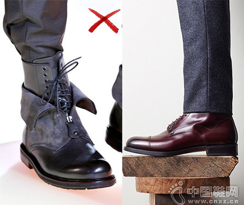 短靴搭配西装裤一定不能太正式,选休闲款的比较好。把宽松西裤裤腿塞进靴子的手法弄不好就有预付嫌疑,无论有没有翻边裤脚应刚好在鞋帮的顶部,刚好衔接。