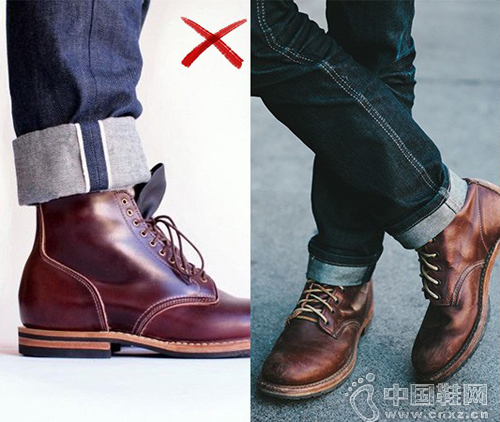 一般来说,最保险的方法就是搭配修身裤型,然后把裤腿塞进靴口,显得比较利落干练,不会有累赘感。如果你的腿不够修长,实在是无法驾驭具有瘦腿效果的裤子,你不妨尝试一下将裤腿翻折一下,根据靴子的高估配合折起的宽度把握在2-5cm之间,自然的遮住一点鞋帮,这样在走动或坐下的时候,脚部的皮肤或袜子不会露太多。