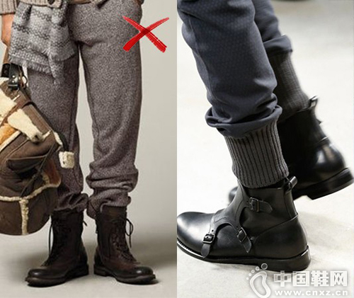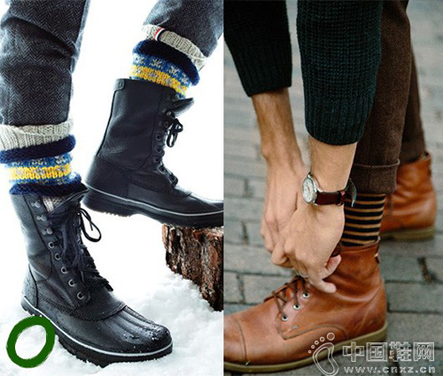 将裤子塞在毛线袜子里,而且袜子要裸露在靴筒外面,这是最硬汉的穿男靴搭配方法。但是天生小短腿请不要尝试,臃肿的脚腕只会让本就不好的比例更惨;不经意露出来的可以是腿部的肌肤,也可以是略带心机的袜子。要让人有眼前一亮的感觉,所以袜子很重要,和衣服同色系或者抢眼的撞色都不错,追求与众不同的可以在花纹上多下功夫。